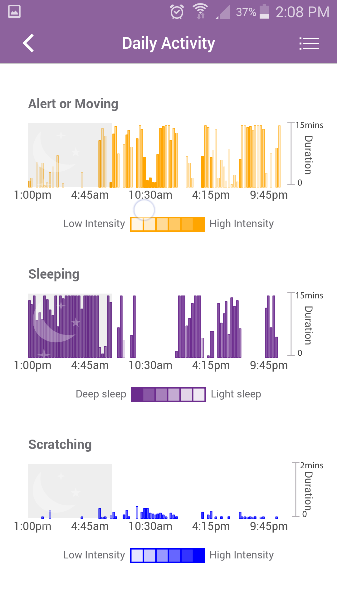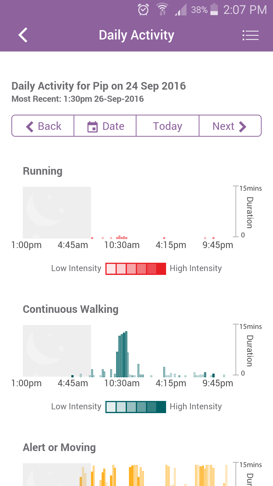 graph. In this format the daily activity is displayed on a number of bar graphs that show when the different behaviours occurred during the day in question.