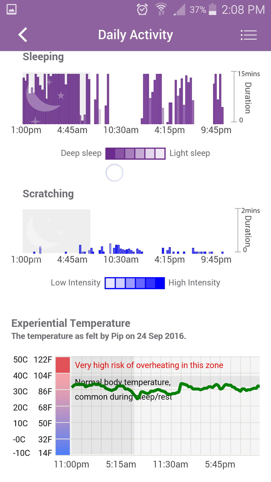 This screen contains a variation on the daily activity graph and the experiential temperature
