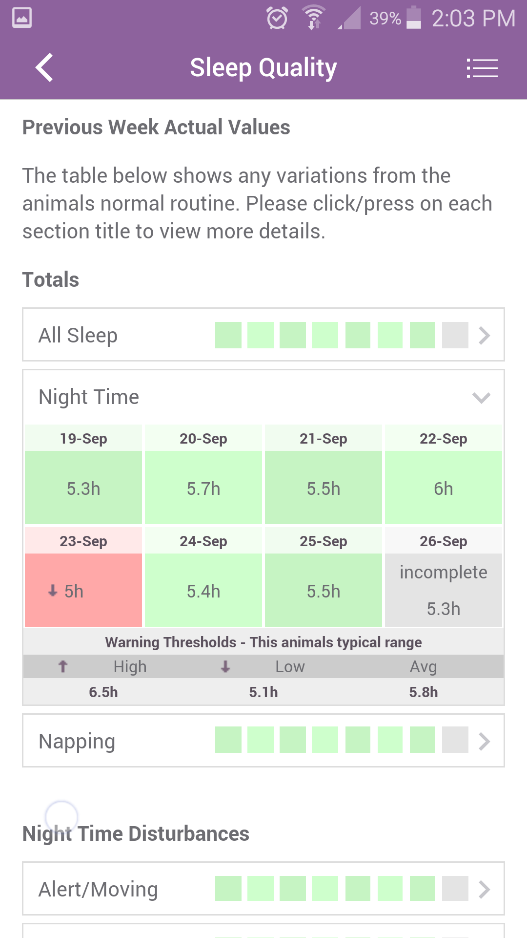 The sleep quality screen contains a modified version of the sleep summary from HeyrexVet allowing your clients to get a clear picture of their pets recent sleeping habits.