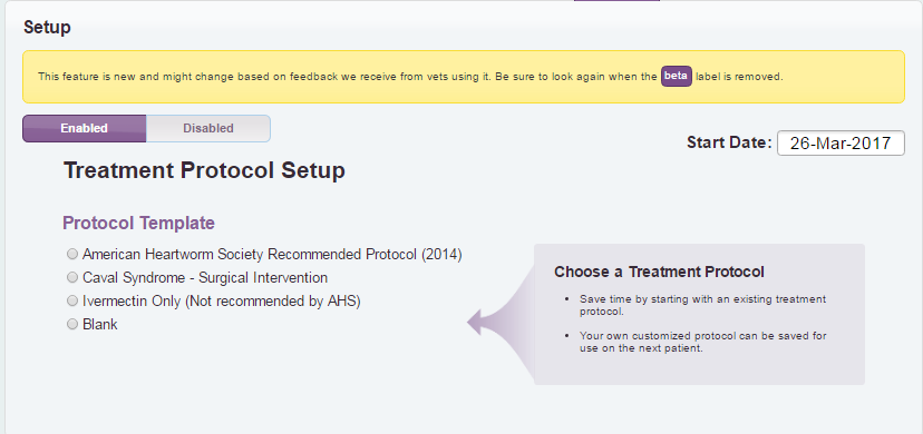When setting up the Heartworm module for one of your patients the first thing you must do is set a start date and decide on a protocol template to use.