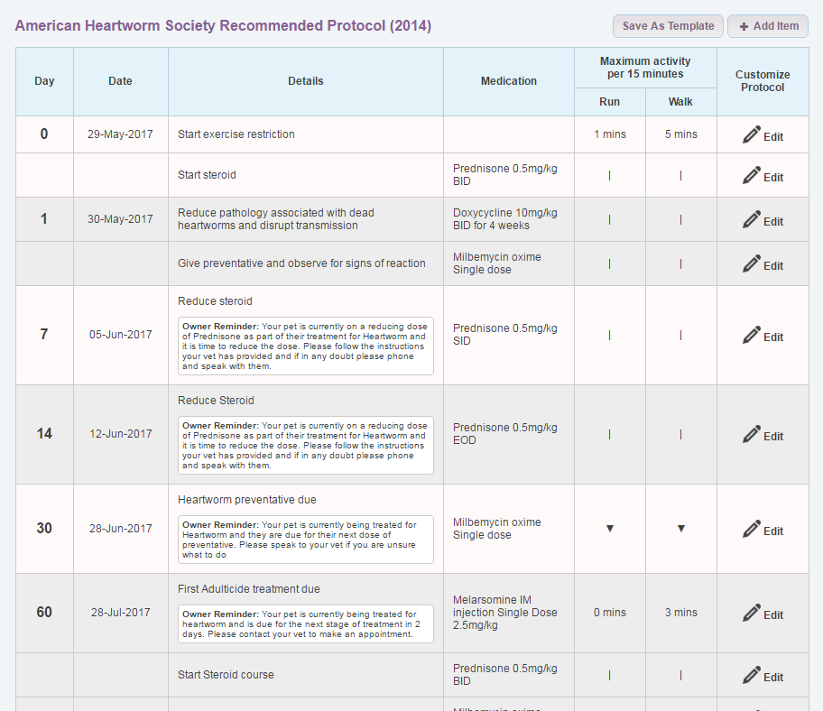 After setting the exercise levels and heartworm preventative treatment you will be directed to a page that lists all the different steps in the AHS protocol.